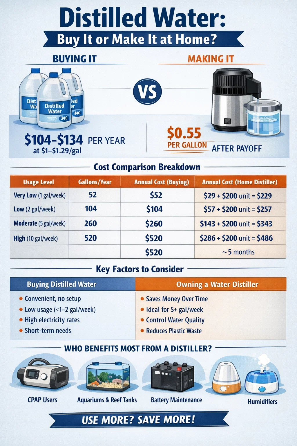 Hindi palaging pinapaboran ng matematika ang pagbili ng water distiller. May mga malinaw na sitwasyon kung saan ang pagbili ng distilled water sa tabi ng pitsel ay ang mas matalinong, mas mura, o mas maginhawang pagpipilian.