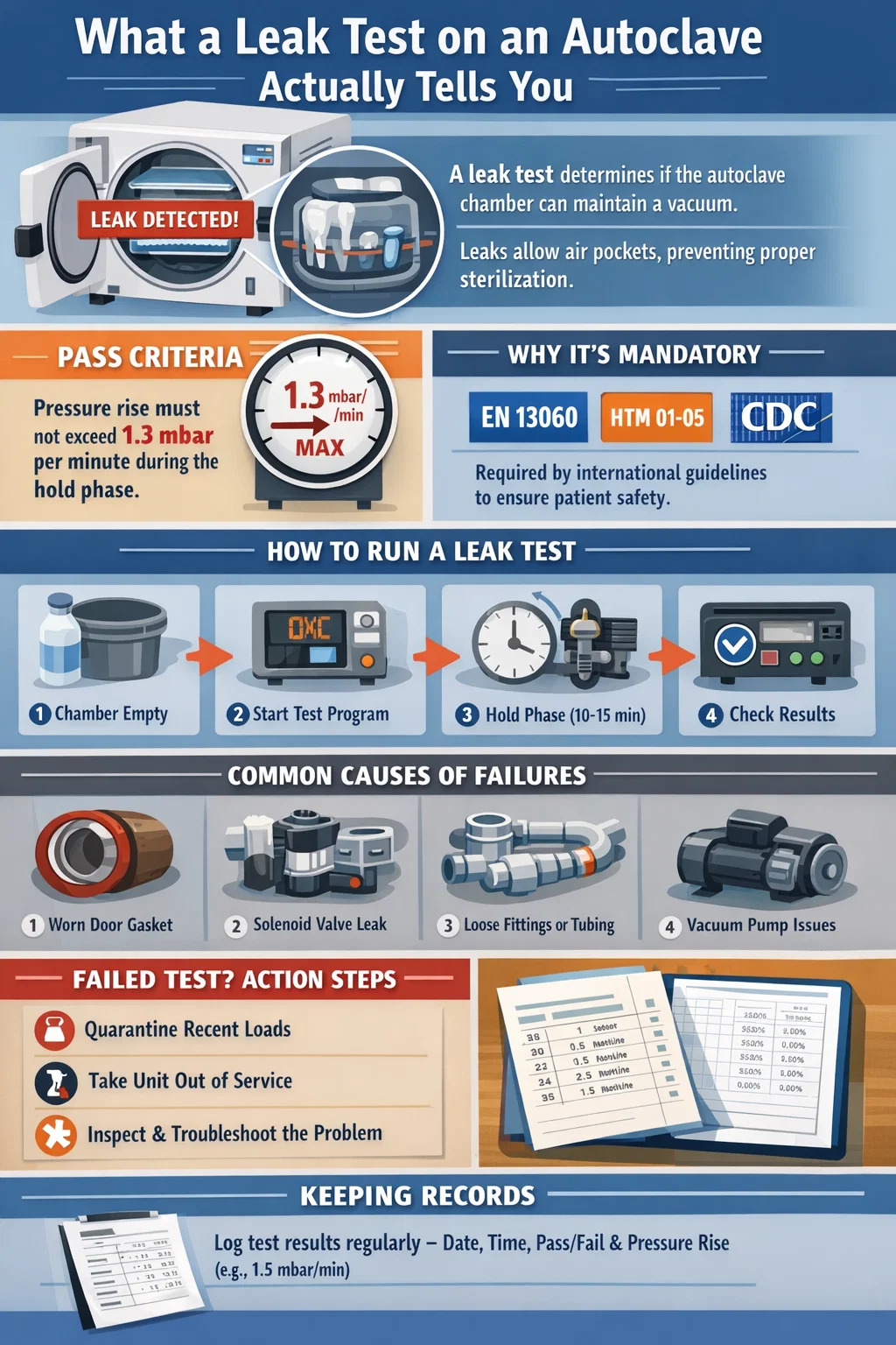 Higit pa sa pagsunod, mayroong direktang mekanikal na dahilan. Gumagana ang mga pre-vacuum dental autoclave cycle sa pamamagitan ng paghila ng serye ng mga vacuum pulse upang alisin ang hangin bago mag-iniksyon ng singaw. Kung ang silid ay tumagas, ang natitirang hangin ay bumubuo ng mga insulating pocket sa paligid ng mga instrumento. Ang temperatura ng singaw sa ibabaw ng instrumento ay maaaring mabasa nang tama sa sensor, ngunit ang aktwal na temperatura ng contact sa mga air pocket na iyon ay maaaring 5°C hanggang 15°C na mas mababa kaysa sa pagbabasa ng sensor ng silid , na sapat upang iwanan ang mga biological na tagapagpahiwatig na hindi hinahamon at mabubuhay ang mga pathogen.