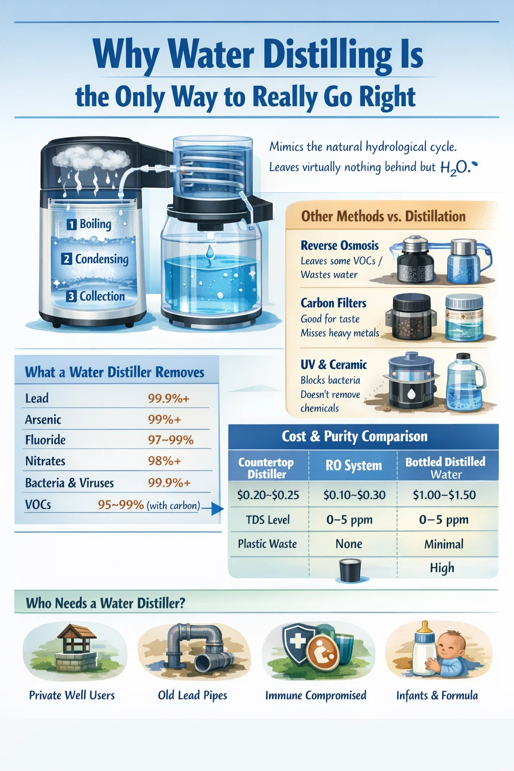 Kung gumugol ka ng anumang oras sa pagsasaliksik ng paglilinis ng tubig, malamang na nakatagpo ka ng mga reverse osmosis filter, activated carbon block, UV sterilizer, at ceramic filter. Lahat sila ay nangangako ng malinis na tubig. Ang ilan sa kanila ay gumagawa ng isang disenteng trabaho sa pag-alis ng mga partikular na contaminants. Ngunit wala sa kanila ang lumalapit sa kung ano talaga ang ginagawa ng water distiller. Kapag sinabi ng mga tao na ang water distilling ang tanging paraan para maging tama, hindi sila madrama. Inilalarawan nila ang isang pisikal na proseso na ginagaya ang hydrological cycle at halos walang iniiwan maliban sa mga molekulang H₂O.