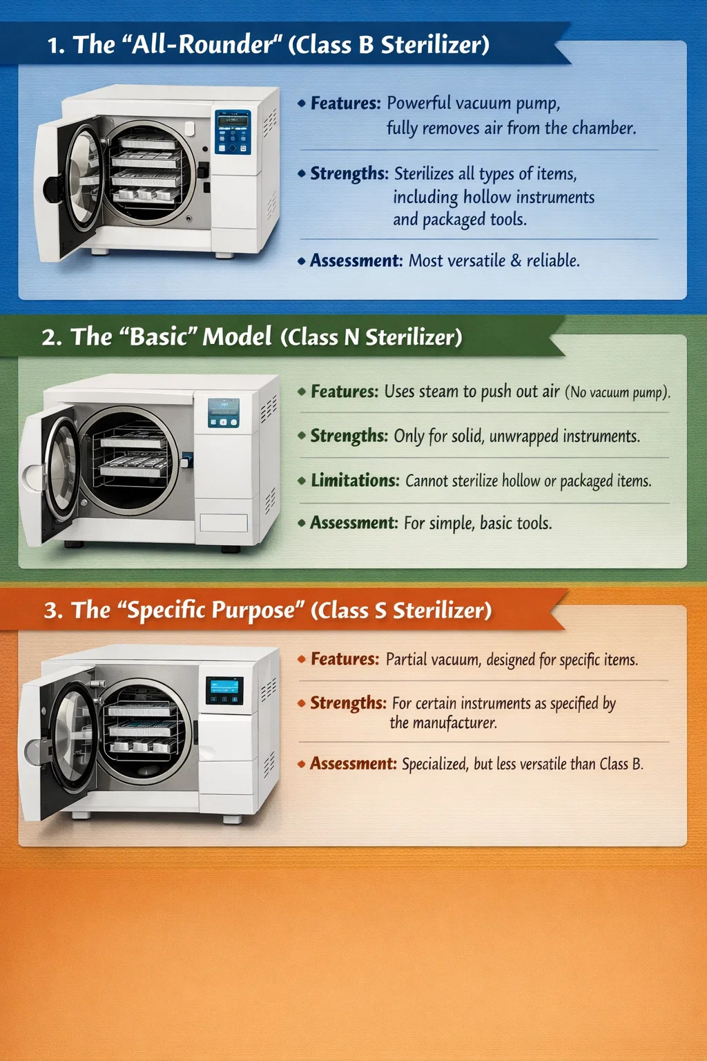 Bagama't ang kagamitan sa isterilisasyon na ginagamit sa mga klinika ng ngipin ay maaaring magkamukha, ang mga ito dental autoclaves ay karaniwang nahahati sa tatlong pangunahing kategorya batay sa kung paano nila pinangangasiwaan ang hangin at ang kanilang mga kakayahan.